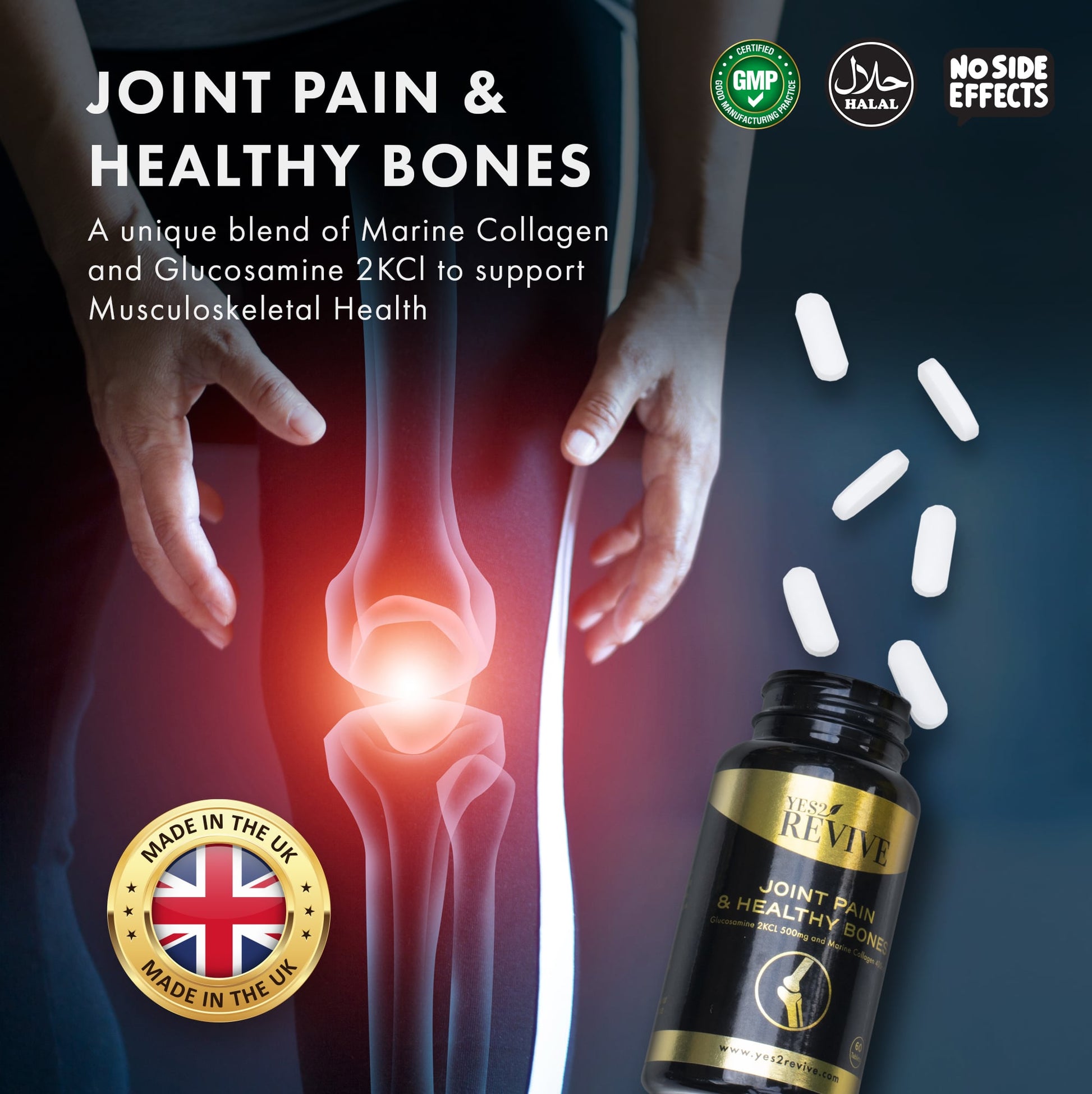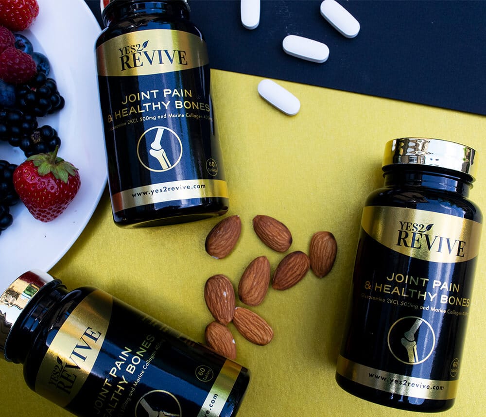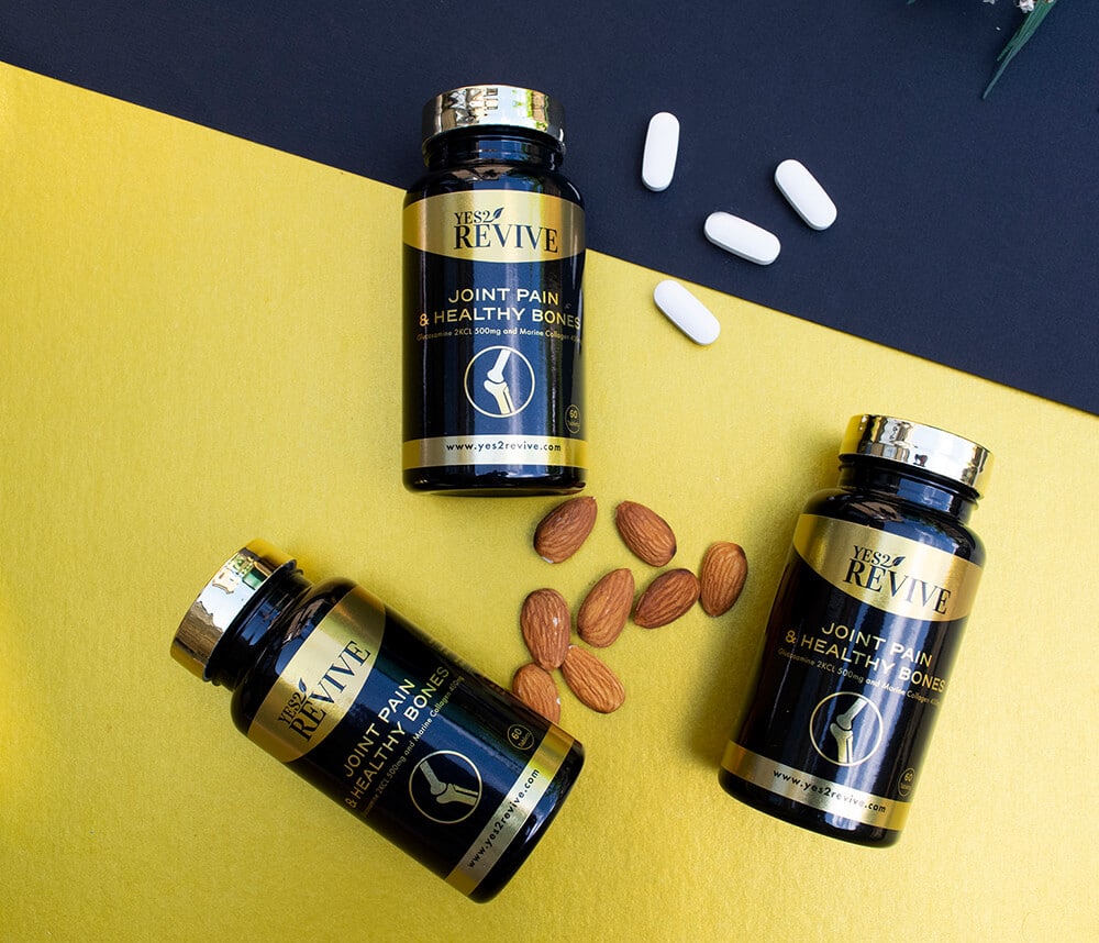 Yes2Revive have created a tablet for joint support and healthy bones which contains a unique blend of Marine Collagen and Glucosamine 2KCl to support and maintain musculoskeletal health. This combination of ingredients provides your body with an easy solution by maintaining a healthy level to keep joints and bones in top condition.